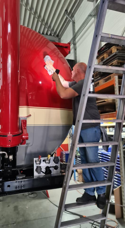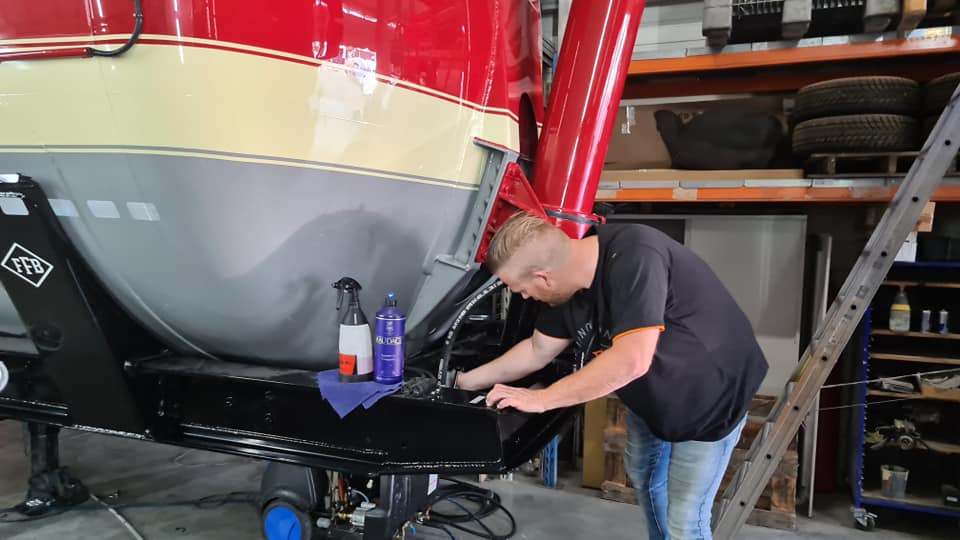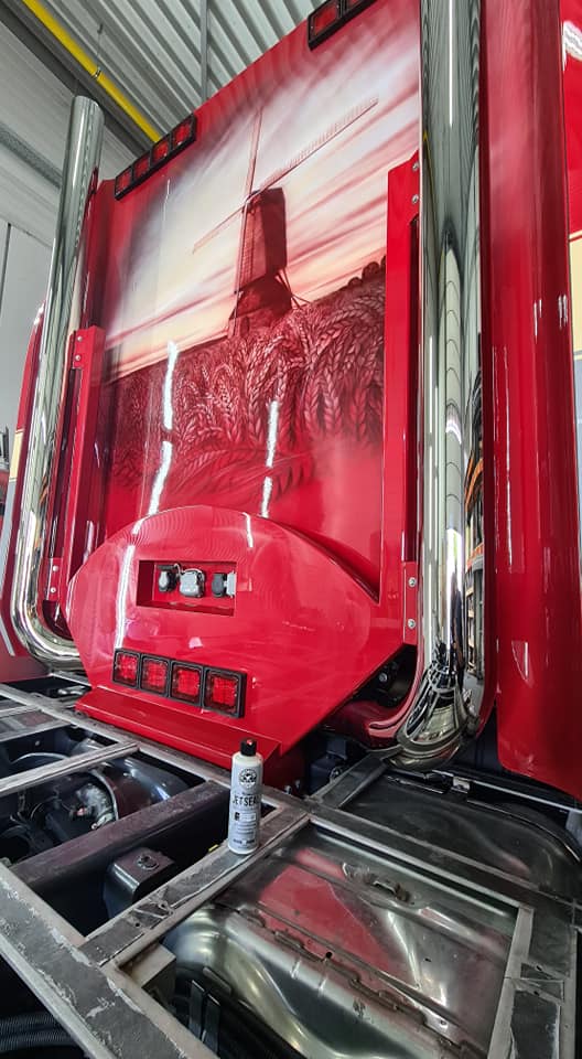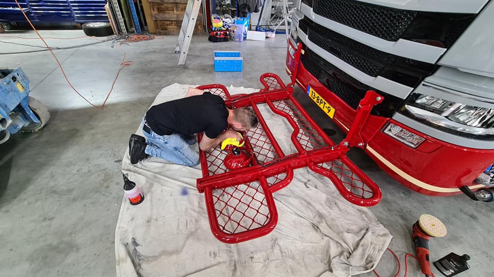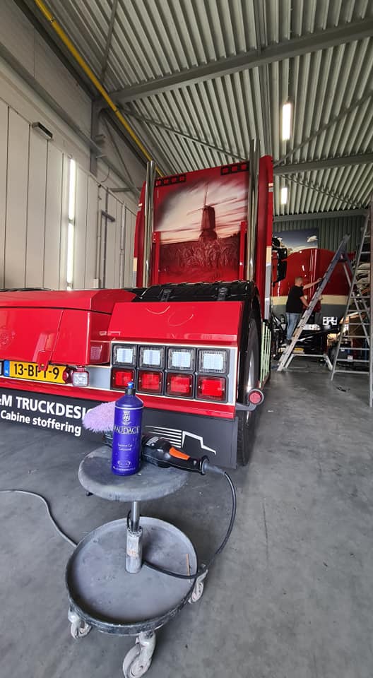 De taken waren goed verdeeld en de trailer mocht een grondige polijst beurt hebben. De trekker heb ik een volledige polijst beurt gegeven en er voor gezorgd dat de lak weer in perfecte staat is. Na het polijsten hebben we de trekker en oplegger in een goede langdurige wax gezet, de banden zijn in gevet en de wagen is klaar gemaakt voor Truckstar.