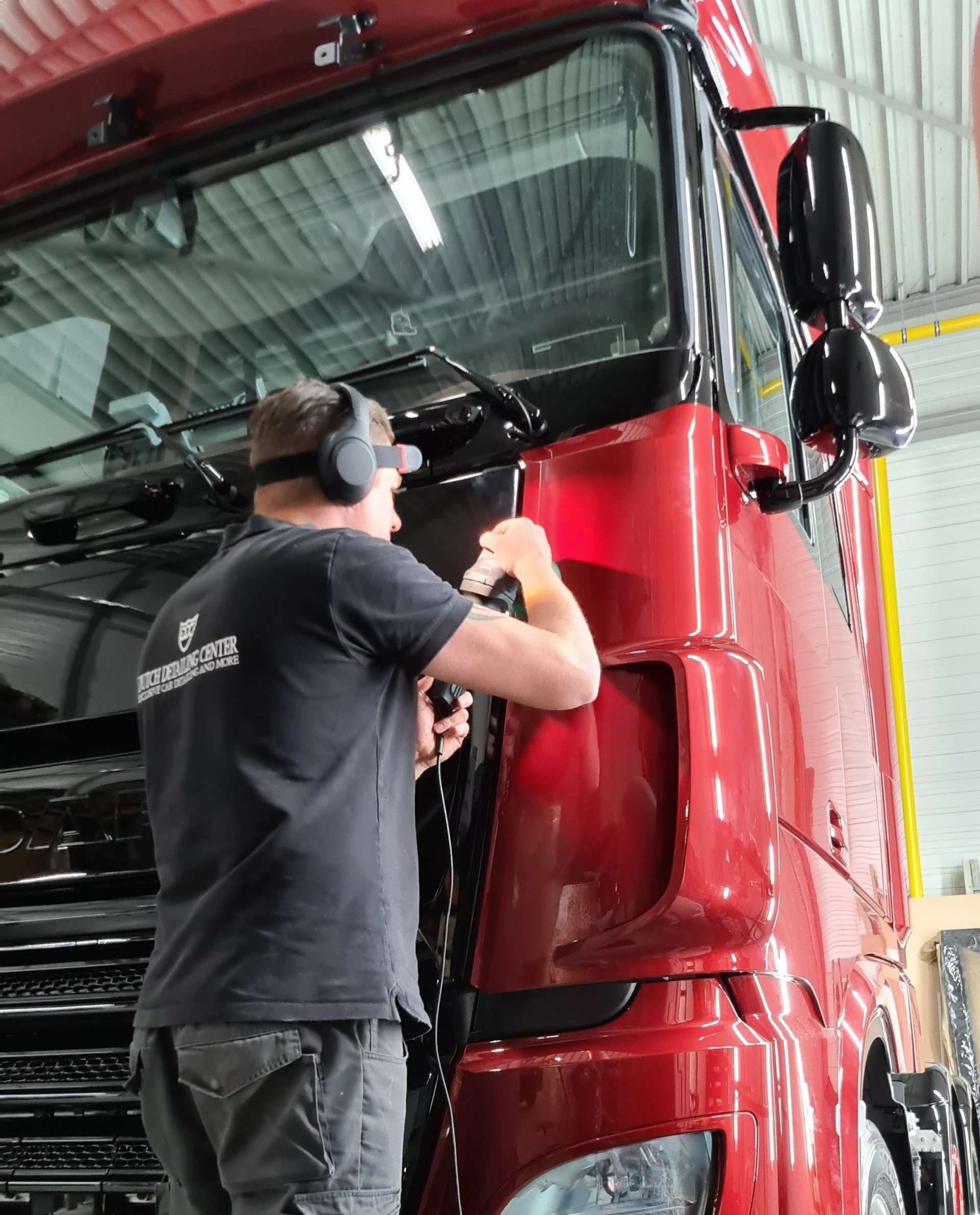 Na het opschuren van de stofjes in de lak hebben we de geschuurde plekken gepolijst. Dit hebben wij door de hardheid van de lak in meerdere etappes gedaan. Dutch Detailing Center werkt enkel met de beste merken en materialen door verschillende merken en materialen te vergelijken. Zo kiezen wij bijvoorbeeld al jaren voor Menzerna als het gaat om onze polijstpasta. Veel merken voegen fillers toe aan hun polijstpasta's, wat maakt dat het extra tijd kost om het project op een succesvolle manier af te kunnen ronden. Onze projecten worden altijd na elke 'hit' afgedaan met isopropyl alcohol, wat eventuele resten polijstpasta van de lak verwijdert. Nadat de hele truck was gepolijst en afgedaan met isopropyl alcohol is hij gecontroleerd of al het werk goed is uitgevoerd. Na deze controle is de DAF opgehaald en afgemaakt door de opbouwer.